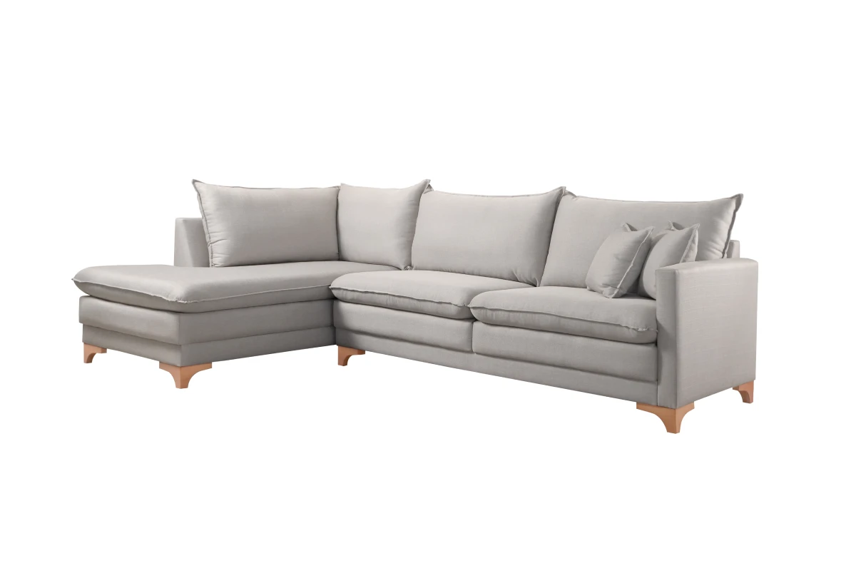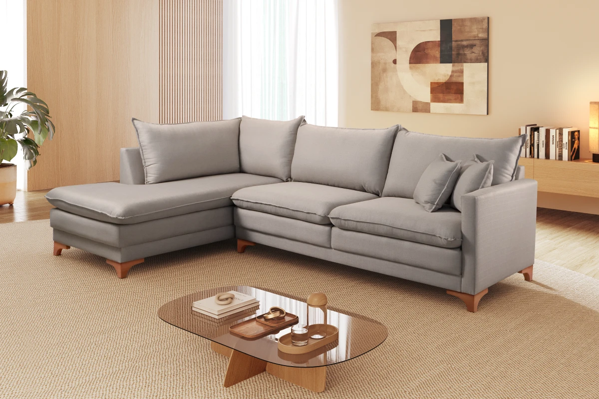 Os pés cantoneira são fabricados em madeira de eucalipto, na cor castanho mel, ou em aço carbono com pintura eletrostática, com silicone injetado na parte inferior para proteção do piso.